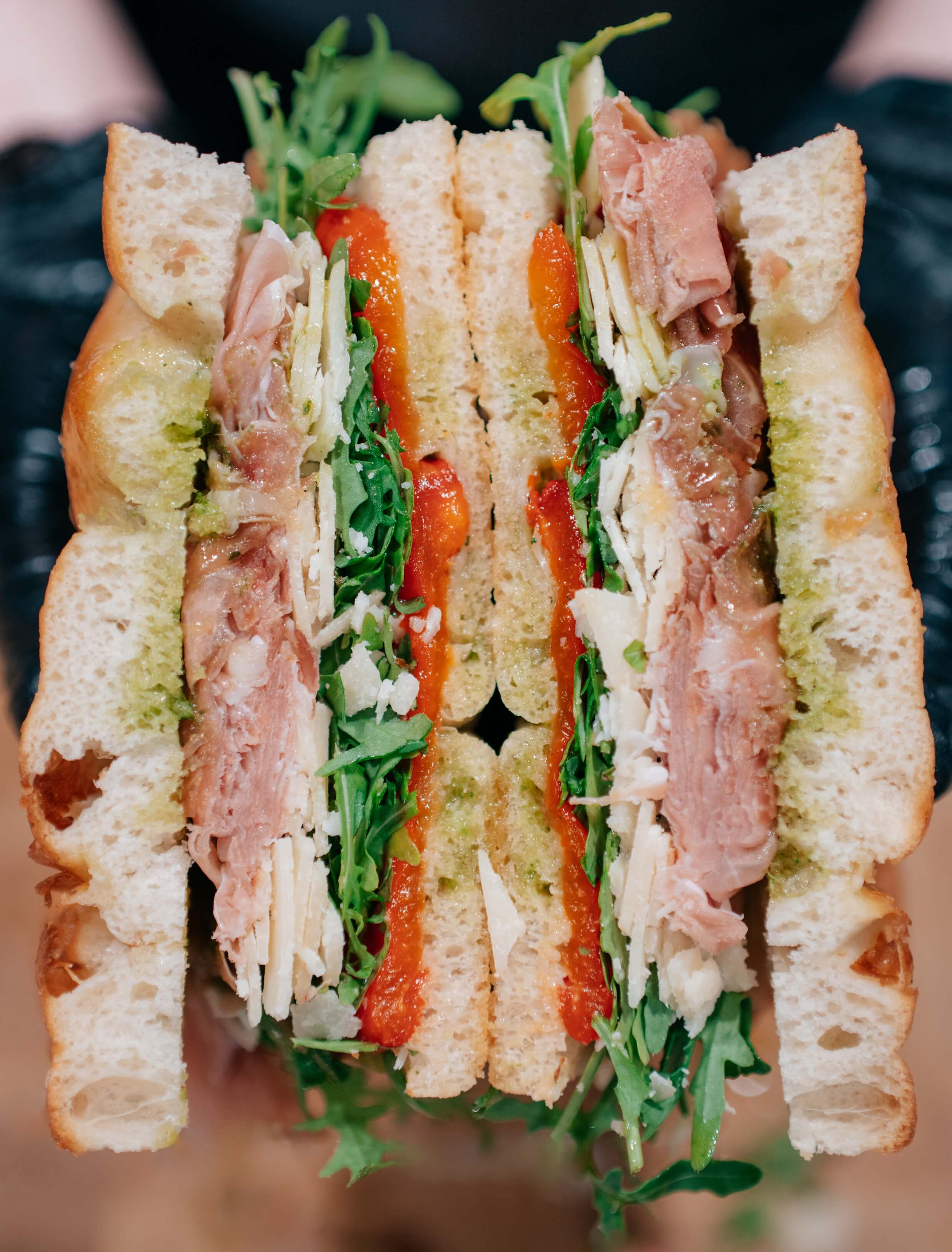 Jambon cru, poivrons rouges au four, roquette, copeaux de parmesan
